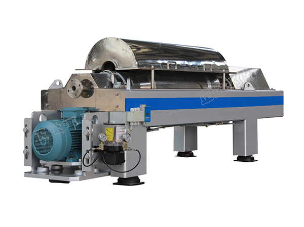 當(dāng)混合液體有進(jìn)料口進(jìn)入高速旋轉(zhuǎn)的轉(zhuǎn)鼓體內(nèi)腔后,混合液體中比重較大的固性物,在離心力的作用下,迅速沉降到轉(zhuǎn)鼓內(nèi)壁,被螺旋推料器從固相出口排出轉(zhuǎn)鼓體外;同時(shí)比重較小的液相則在離心力的作用下形成內(nèi)層液環(huán),通過液相溢流口排出轉(zhuǎn)鼓體外。轉(zhuǎn)鼓與螺旋推料器同時(shí)高速運(yùn)轉(zhuǎn),由于兩者之間存在一定的轉(zhuǎn)速差,使得沉降在轉(zhuǎn)鼓壁上固性物不間斷地被螺旋推料器推送至出液口排出,整個(gè)分離過程連續(xù)進(jìn)行。